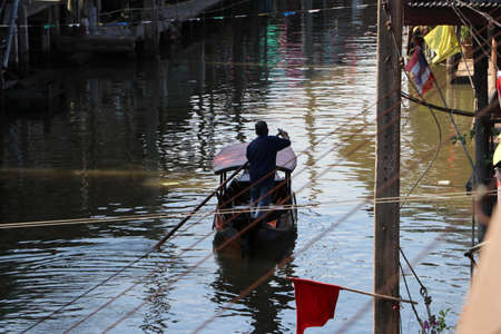 Life along the canal and boatman rowing the Thai traditional small rowboat on the canal at Damnoensaduak Thailand.