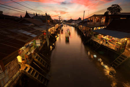 Samut Songkhram, Thailand - April 12, 2019 : Amphawa Floating Market with beautiful twilight sky