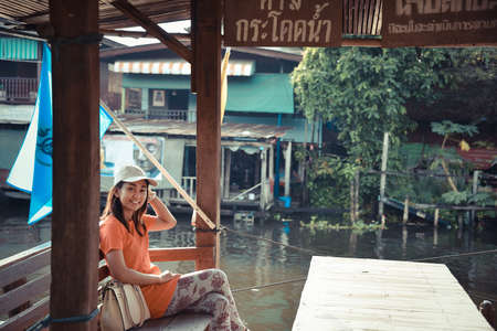 Travelers women photographer travel journey visit and use camera mirrorless shooting take photo life lifestyle of local thai people riverside at Khlong Bang Luang Floating Market in Bangkok, Thailand