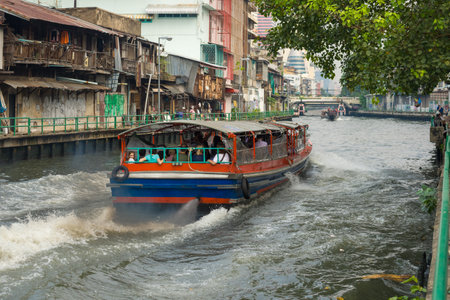 Bangkok, Thailand - July, 30, 2017 : Motorboat Travel in Khlong Bang Noi Chao Phraya River Branch Canal at Bangkok, Thailand.