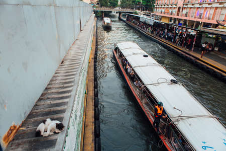 BANGKOK, THAILAND - FEBRUARY 13, 2018: River bus in Bangkok. Public transport service boats at canals. The view from the bridge.