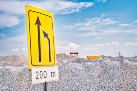 Close up of sign of road work on background of blue sky with white clouds. Information for traffic participants about carrying out repairs on road. Concept of careful and attentive driving