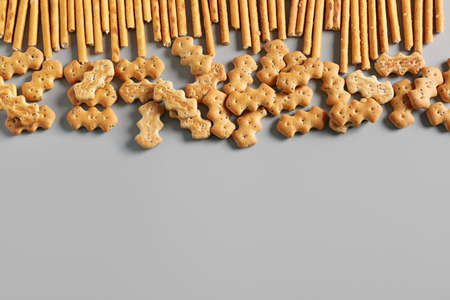 Tasty different crackers on light background