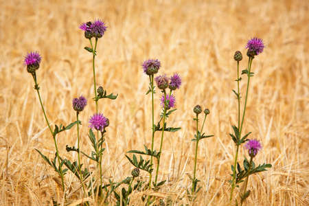 Beautiful violet thistle flower growing on wild uncultivated field.