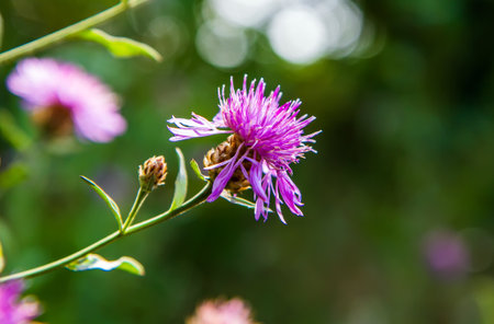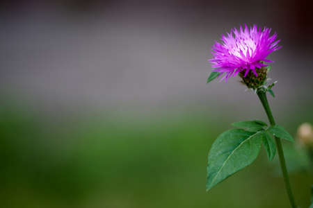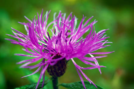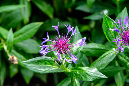 Knapweed close-up. Purple bright flower on a background of green leaves. Beautiful botanical floral background. Flowering plant side view