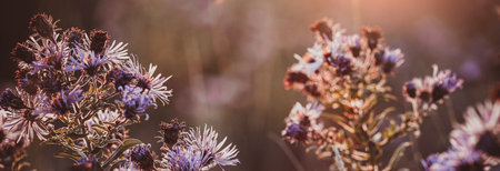 Purple plants over a warm countryside background. Summer. Horizontal