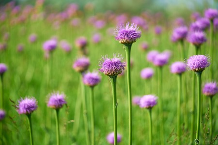 Beautiful purple thistle flowers in a meadow. Selective focus.