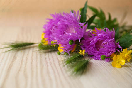 Bouquet of beautiful wildflowers on wooden table, closeup