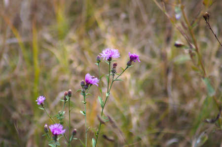 Purple cornflowers in green grass in the field. Many wildflowers. Cornflower rough grows in the field. Centaurea scabiosa