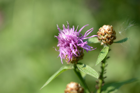 Brown knapweed in bloom close-up view with green blurred plants on background