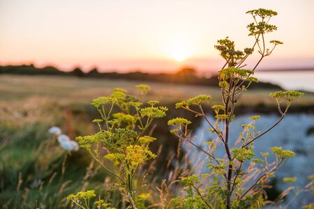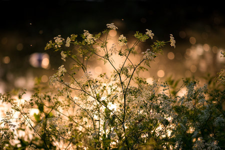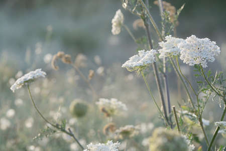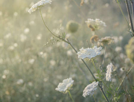 Agricultural field at sunset. White Heracleum (plant) wildflowers close-up. Soft sunlight. Idyllic summer rural scene. Textures. Nature, environnement, farm, dangerous and poisonous plants