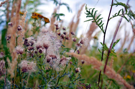 Low angle view into the flower field with creeping thistle in foreground during late summer. Beauty in nature.