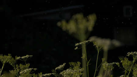 A flock of midges. Creative. Filmed small insects circling around the grass with flowers with bright rays of the sun.