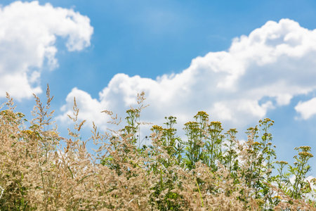 Wildflowers on summer field. Aegopodium podagraria plants.