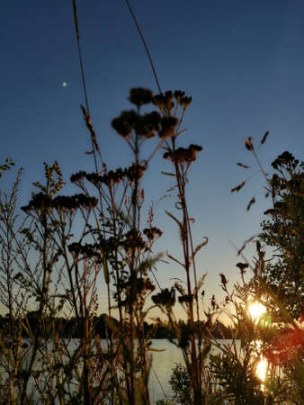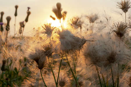 Blooming thistle thickets at sunset. Atmospheric summer rural landscape.