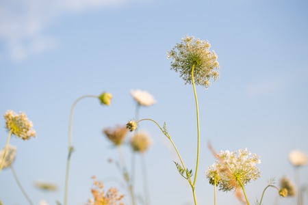 Wild cow parsley close up detail with blue sky and clouds on the background