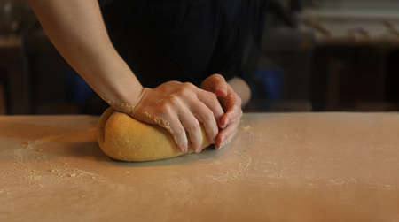 Close up view of baker kneading dough. Homemade bread. Hands preparing bread dough on wooden table. Preparing traditional homemade bread. Woman hands kneading fresh dough for making bread