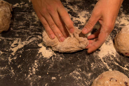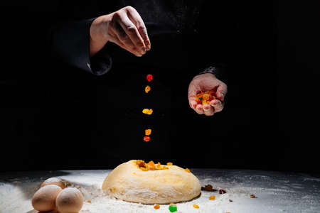 Bread making. Knead the dough in a cloud of flour dust. Food preparation concept on dark background
