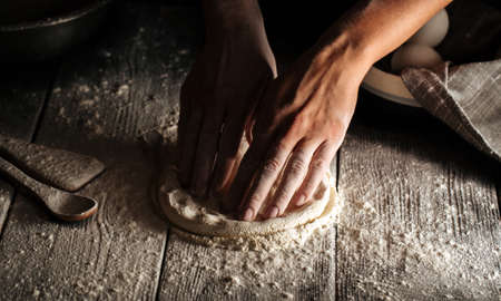 Unrecognizable woman kneading dough. Dough for dumplings, dumplings, pies.