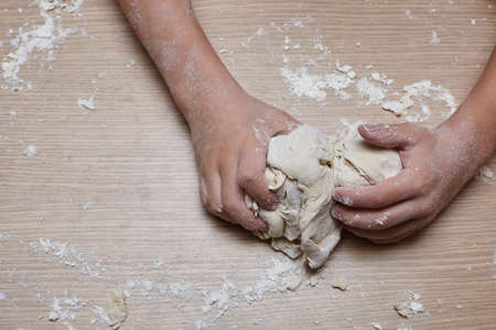 Chef hands kneading dough on wooden kitchen table. Preparation for baking