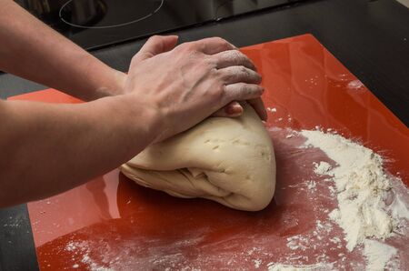 A man kneads dough with flour on a baking sheet with his hands. Dough for pizza or bread. Home cooking and baking. The cooking process.
