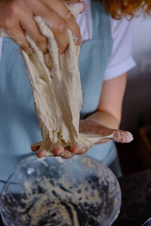 Preparing dough for white bread, rolls, pizza. Yeast dough made from wheat flour.