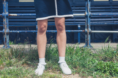 Legs and sneakers on the sea beach. Travel Lifestyle Summer vacations. Trendy concept.