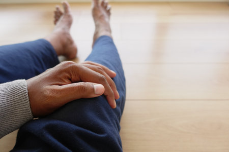 A man sitting in a chair touches his knee, suffers from repeated painful sensations about knee pain associated with the proximal aging process, tendonitis and arthritis, degenerative joint concept.