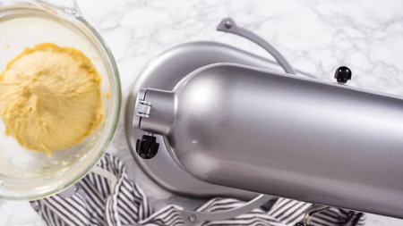 Step by step. Flat lay. Mixing royal icing in electric kitchen mixer for Easter cookies.