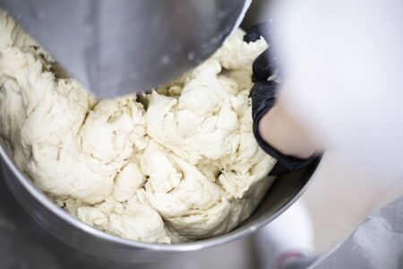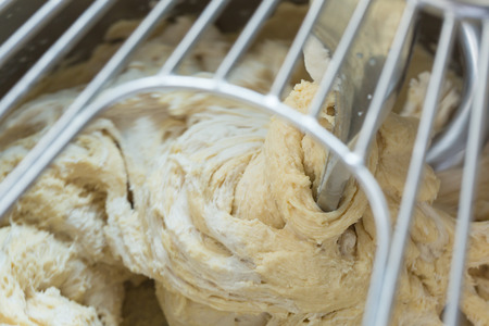 Large amount of dough being kneaded in industrial mixer in a bakery