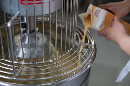 Woman professional pastry chef preparing a dessert. Adds ingredients and mixes the dough in a mixer.
