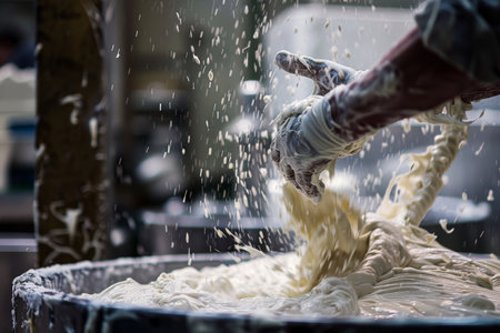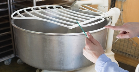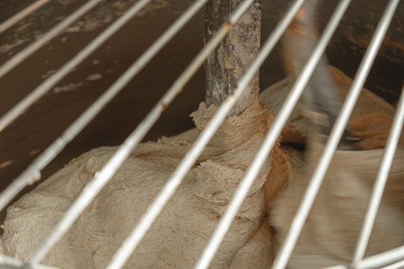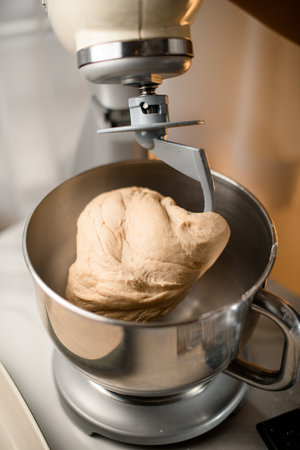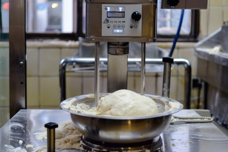 Mixing dough in an industrial kitchen during a busy baking session at a local bakery in the early morning hours to prepare fresh bread and pastries