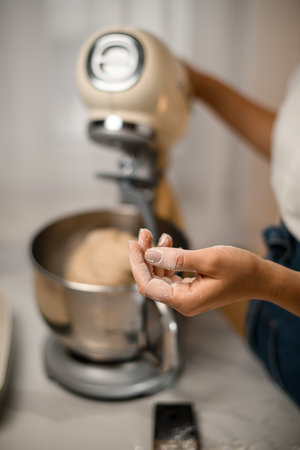 selective focus on female hand in flour against blurred modern kitchen mixer.