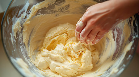 Hands mixing ingredients in a large bowl, preparing a homemade cake batter