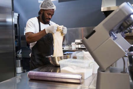 Man confectioner in uniform mixing dough with kneader machine at the manufacturing