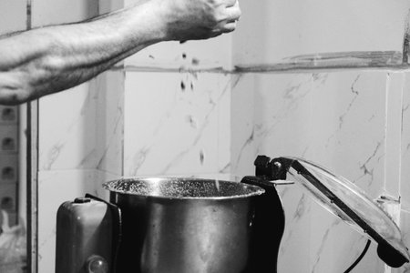 making gelato ice cream with modern professional equipment preparation detail in kitchen interior black and white photo