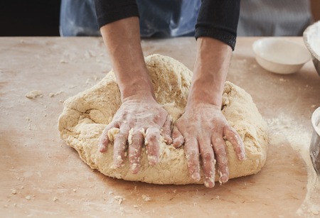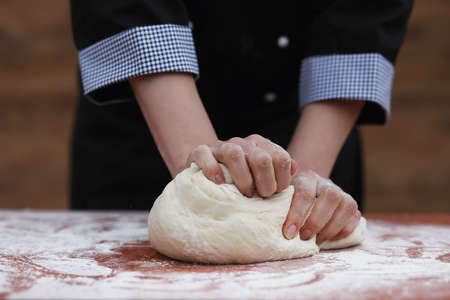 Chef hands kneading dough on wooden kitchen table. Preparation for baking