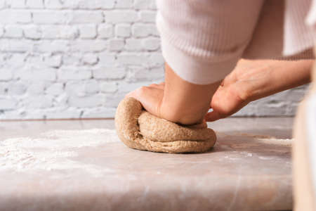 process of baking health bread at home. low angle closeup woman hands kneading dough from rye flour on marble countertop in bright kitchen.