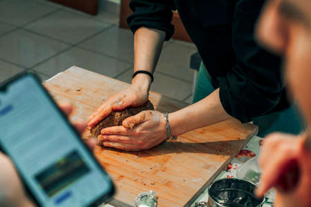 Close-up of the hands of a woman preparing traditional bread on a wooden table
