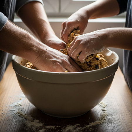 Close-up of hands kneading dough on a floured surface, capturing the essence of homemade baking. The ambiance suggests warmth and creativity in the kitchen.