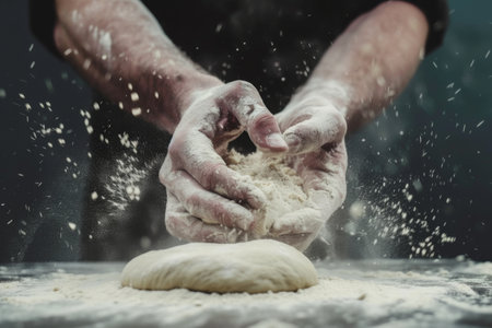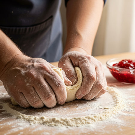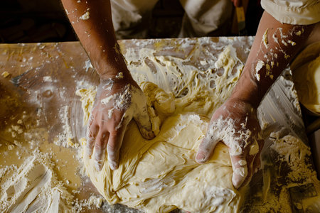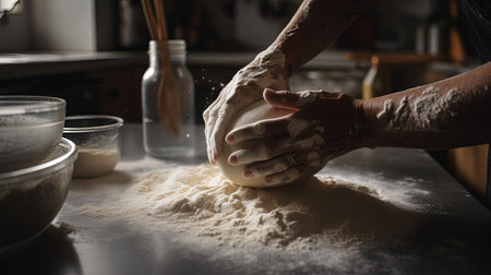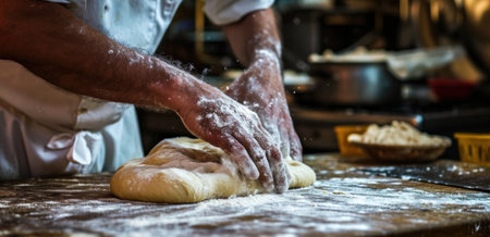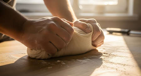 A person wearing an apron kneads dough on a floured surface, creating a rustic ambiance. Fresh ingredients and natural lighting enhance the traditional baking process.