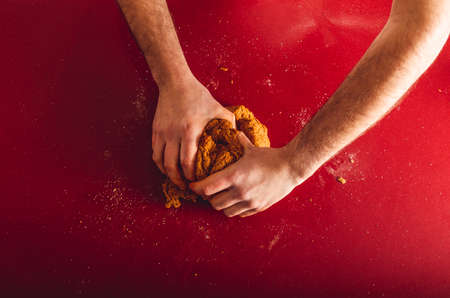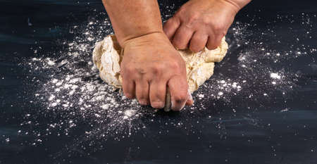 A man kneads dough with flour on a baking sheet with his hands. Dough for pizza or bread. Home cooking and baking. The cooking process.