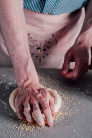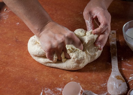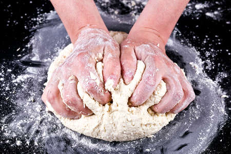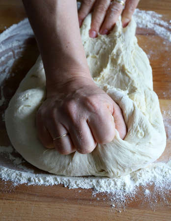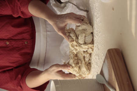 Unrecognizable woman kneading dough. Dough for dumplings, dumplings, pies.