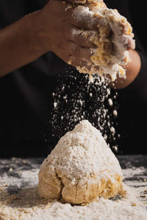 Hands of the cook with flour on a dark background. The process of making muffins.