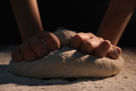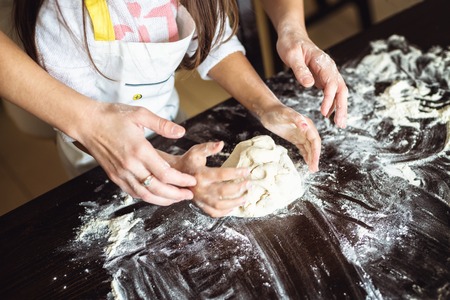 Close up image woman and little daughter knead dough with hands wooden table powdered with flour.
