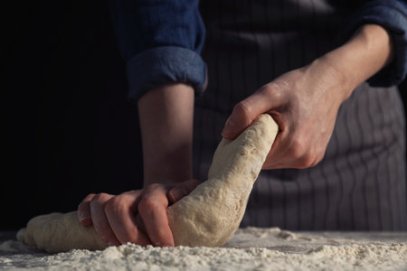 The chef in black apron makes pizza dough with your hands on the table. The dark background
