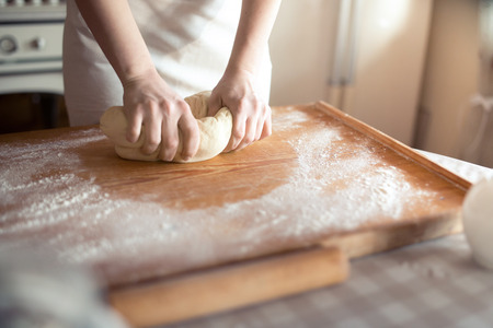Woman hands kneading dough on board sprinkled with flour on background of light scandi kitchen