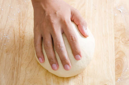 Fresh dough kneaded by hand on wooden countertop flour dusted