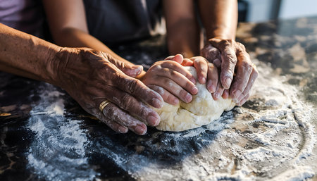 Intimate, photorealistic close-up of a grandmother and grandchild kneading dough together on a dark, flour-dusted surface.