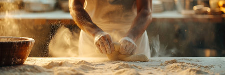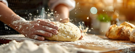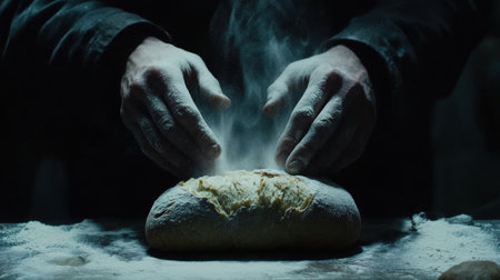 A close up shot of a baker's hands kneading dough on a wooden surface, with bread loaves in the background. Flour dusts the air, creating a warm, inviting atmosphere.